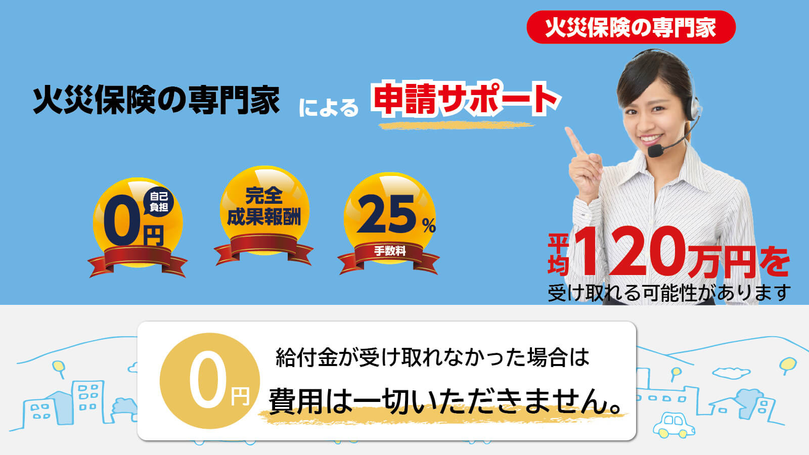 火災保険申請サポートナビでは、お問い合わせ頂いてから調査まで無料でサポートさせていただきます。費用は完全成果報酬で、保険金が受け取れた場合に限り手数料を頂いています。万が一、保険金が受け取れなかった場合は費用は頂いておりません。グループ全体では年間1000件以上の実績があります。当然、プロの目線のサポートを受けることで、保険金の認定率や受給金額がアップする傾向があります。